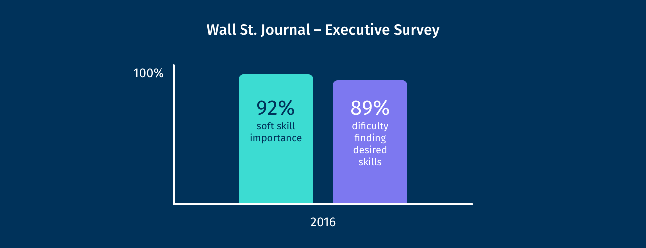 A 2016 Wall Street Journal survey revealed that C-Suite executives rank soft skills as equally or more important than technical skills. These executives also indicated they are having a difficult time finding qualified candidates with these critical skills, including empathy, critical thinking, problem-solving, effective communication and more.
