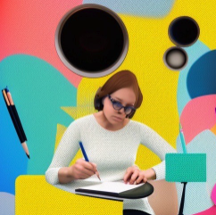 Above, an AI generated image by Photoleap from the word prompt: “Woman writing a colorful article about the benefits and risks of AI content generation.”