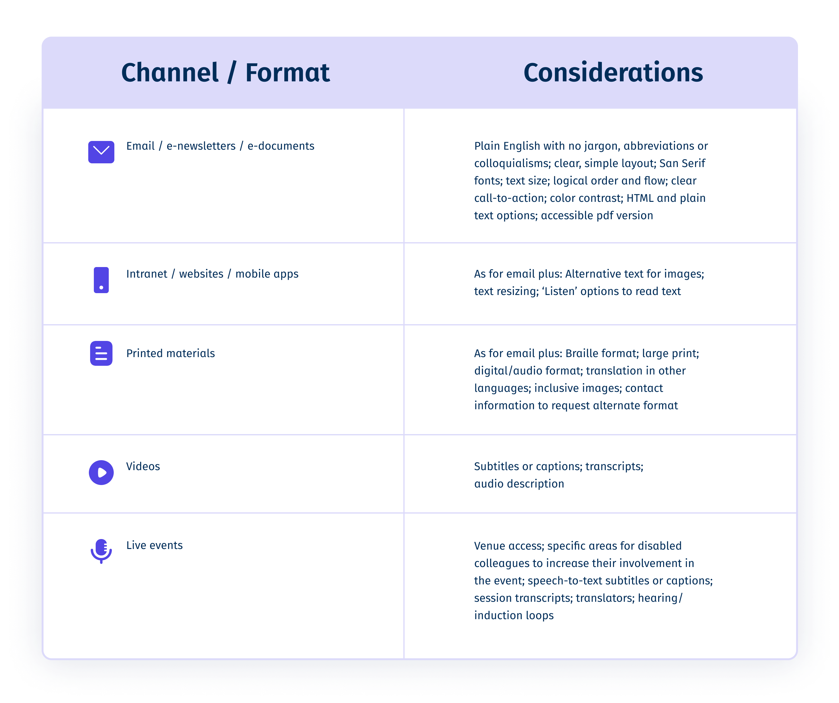 Below are some practical considerations for creating more inclusive and accessible communications and channels to get you started: